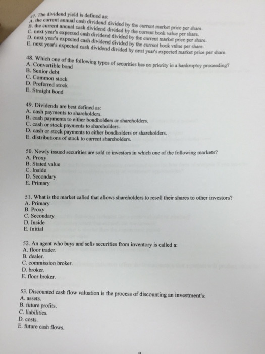 Cash or stock payments to either bondholders or shareholders. Cash payments to either bondholders or shareholders. The dividend yield is defined as.