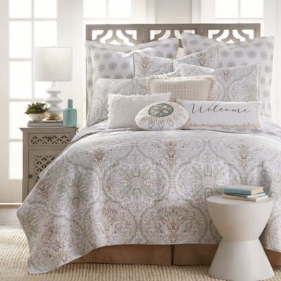 The Levtex Home Beach Life FullQueen Quilt Set with 2 Standard Shams includes one fullqueen quilt and two standard shams in navy and cream colors. Levtex Home Life is Better Lake with Tassels Oblong Throw Pillow in Taupe.